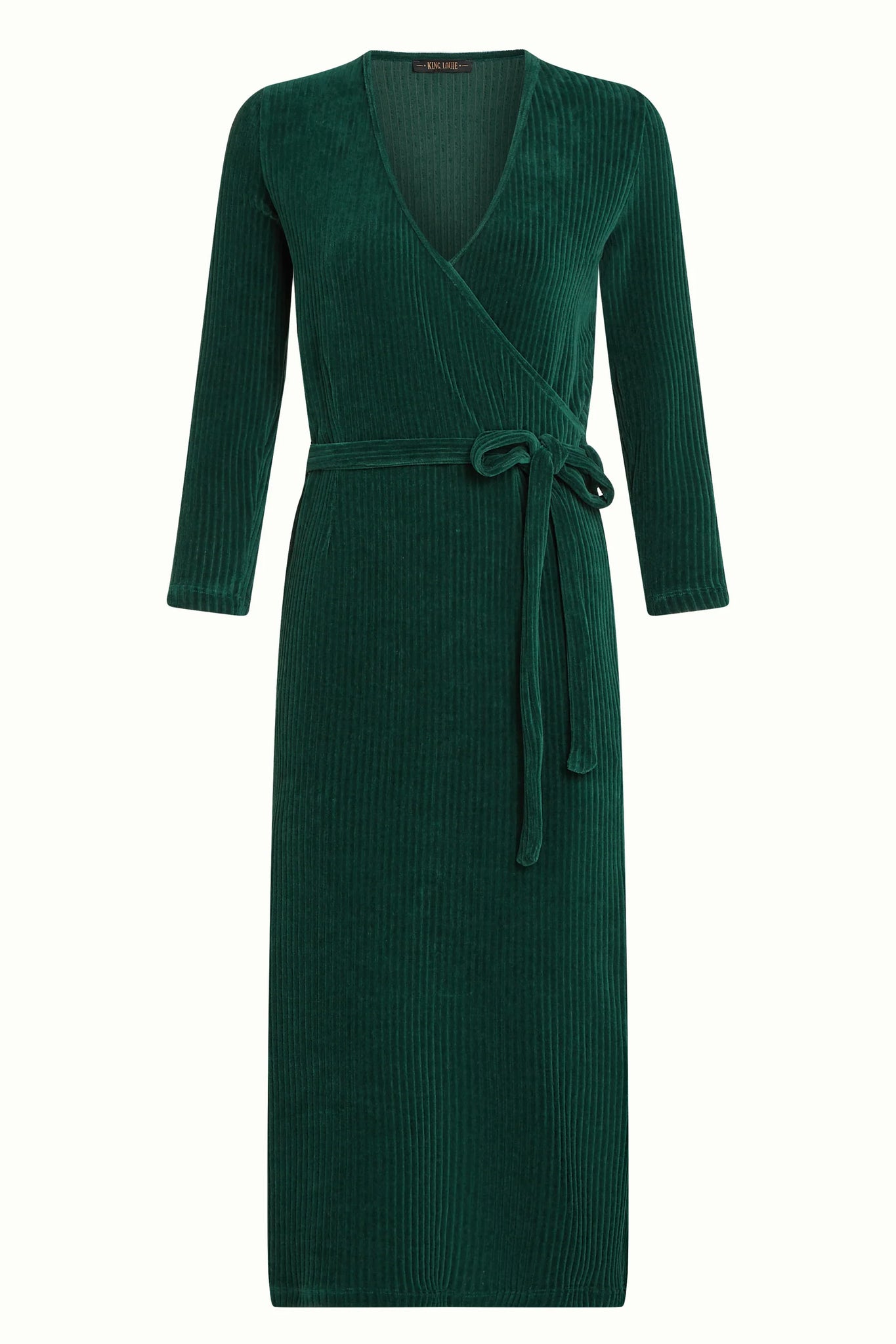 This wrap dress, made from stretchy cotton corduroy velvet, features a tie belt, long sleeves, and a V-neckline, offering a sleek and comfortable silhouette you'll love to wear.