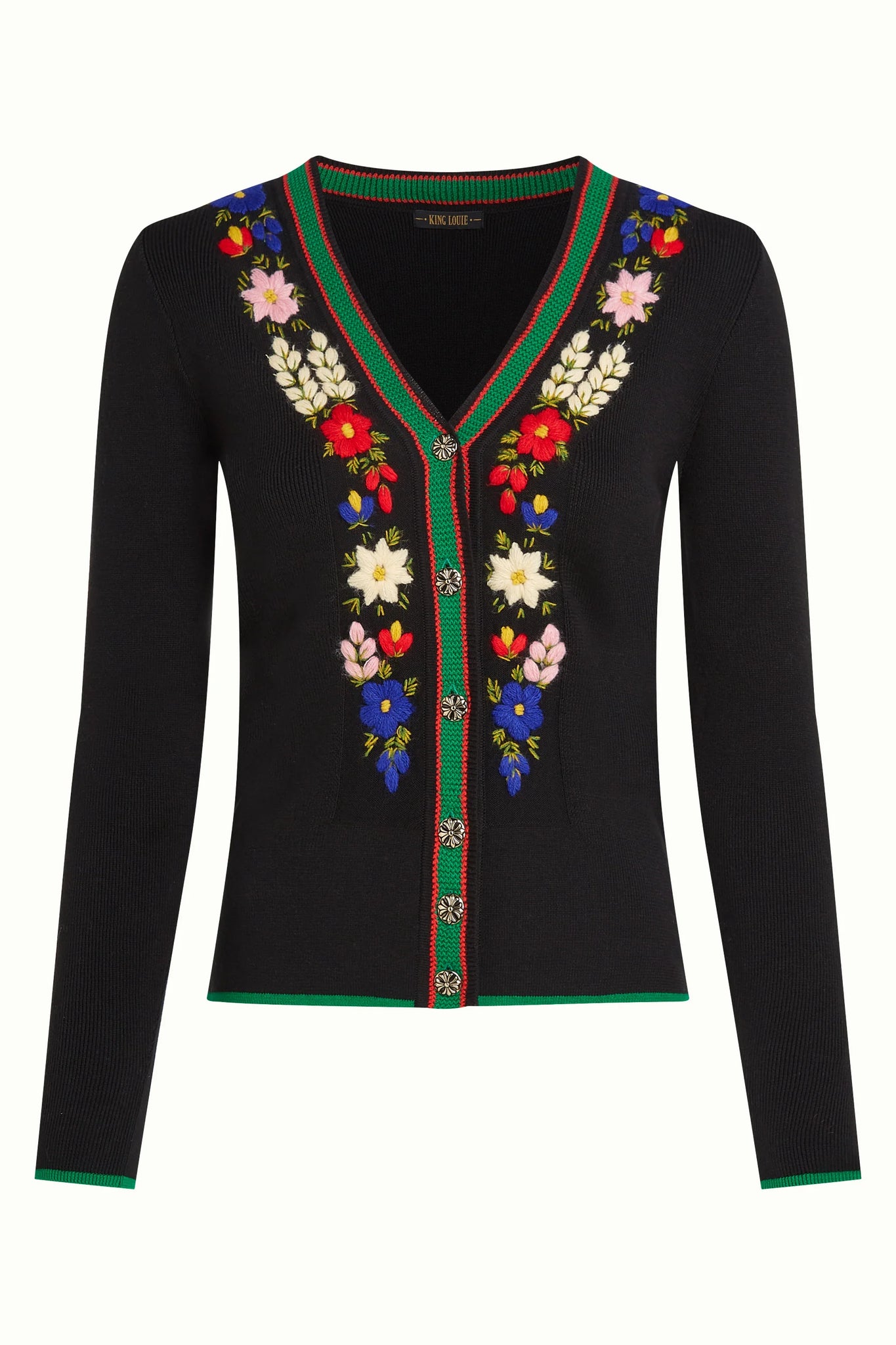 This stylish cardigan combines vibrant floral embroidery with green and red trim for a unique look. Crafted from stretchy cotton knit, it offers comfort and a flattering regular fit. The V-neck and ornate buttons add elegant details, making it a perfect choice.