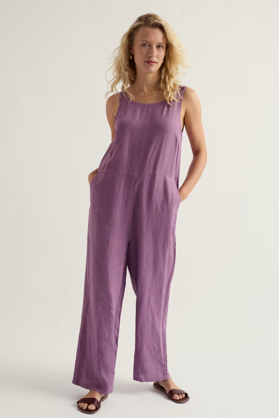 Product Details Our popular Salt Air Jumpsuit, cut for a comfortable fit with a relaxed wide leg. The simple shape is perfect for layering over crisp T-shirts or long sleeve tops. We’ve finished it with button detailing at the shoulder and a V cut back.